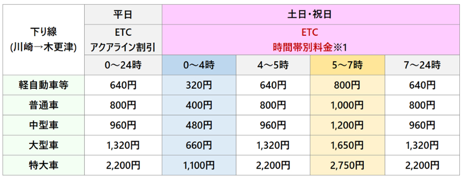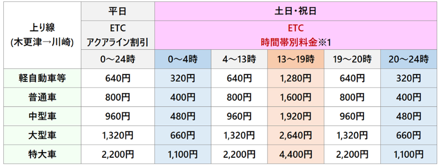 アクアラインは通る時間によって高速代金も変わります。渋滞しているのに高速料金も高いなんて辛いので、ゆとりのある方は下記の表をみて帰る時間を調整するとよいかもしれません。