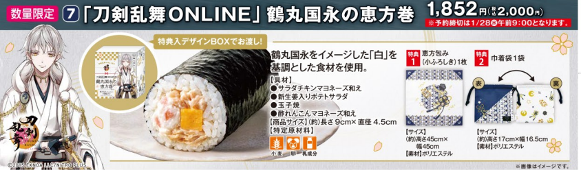 刀剣乱舞ONLINEの人気のキャラクター鶴丸国永をイメージした恵方巻と風呂敷と巾着がついて限定BOXで買えるそうです。