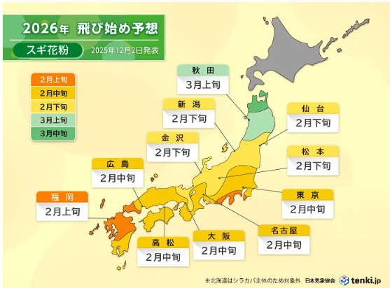 飛散開始時期は「例年並み」で、2月上旬から九州・東海・関東の一部などで本格的な花粉シーズンに入り、東北や北海道はその後に続く見込みです。